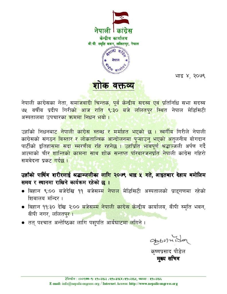 काठमाडौं, ५ भदौ । नेपाली कांग्रेसका नेता एबँ प्रतिनिधी सभाका साँसद प्रदीप गिरिको आज अपरान्ह् अन्त्येष्टि गरिँदैछ । हिजो राति साँढे ९ बजे ७५ वर्षको उमेरमा उपचारकै क्रममा मेडसिटी अस्पतालमा निधन भएका गिरिको आज हिन्दू संस्कार अनुसार अन्त्येष्टि गरिन लागेको हो ।