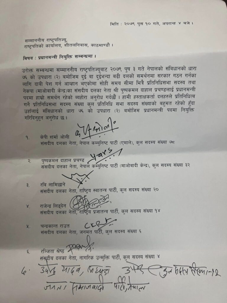 यसअघि दाहाललाई प्रधानमन्त्रीमा नियुक्त गर्नकालागी नेकपा एमाले सहित सात दल तथा तिन स्वतत्र साँसदले राष्ट्रपती कार्यालयमा निबेदन दर्ता गराएका थिए ।