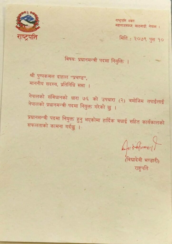 काठमाण्डौ,१० माघ । राष्ट्रपती बिधादेबी भण्डारीले नेकपा माओवादी केन्द्रका अध्यक्ष पुष्पकमल दाहाल प्रचण्डलाई प्रधानमन्त्री प्रधानमन्त्रीमा नियुक्त गर्नुभएको छ । नेपालको संविधानको धारा ७६ को उपधारा (२) बमोजिम दुई वा दुईभन्दा बढी दलको समर्थनमा राष्ट्रपतीले दाहाललाई प्रधानमन्त्रीमा नियुक्त गर्नु भएको हो ।