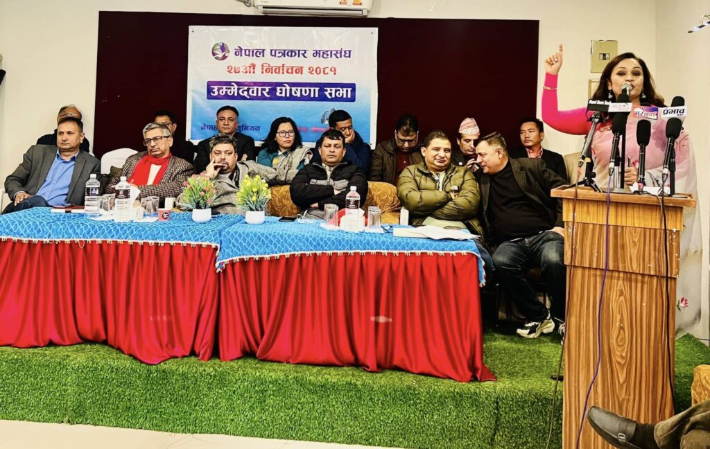 काठमाण्डौ, २३ मंसिर । सतहमा देखिएको सदस्यता बिबादका कारण पटक पटक मिती घोषणा गरेर पनि स्थगित हुँदै आएको नेपाल पत्रकार महासँघको निर्बाचन आगामी २८ गते हुने भएको छ । देशभरका पत्रकारहरुको छाता सँगठनको निर्बाचनको लागी उम्मेद्धवारको अन्तिम नामावली आएसँगै उम्मेद्धवारहरु गुट निर्माणमा ब्यस्त छन । अध्यक्षमा ४ जनाले भिडन्त गर्दै गरेको भएपनि ३ जनाले प्यानलनै खडा गरिसकेका छन । सत्ता पक्षिय प्यानलको नेतृत्व पत्रकार निर्मला शर्माले गरेकि छिन । शर्मालाई नेकपा एमाले निकट प्रेस चौतारी र नेपाली काँग्रेस निकट प्रेस युनियनको समर्थन छ । यो प्यानललाई सत्तापक्ष प्यानल पनि भन्न थालेका छन ।