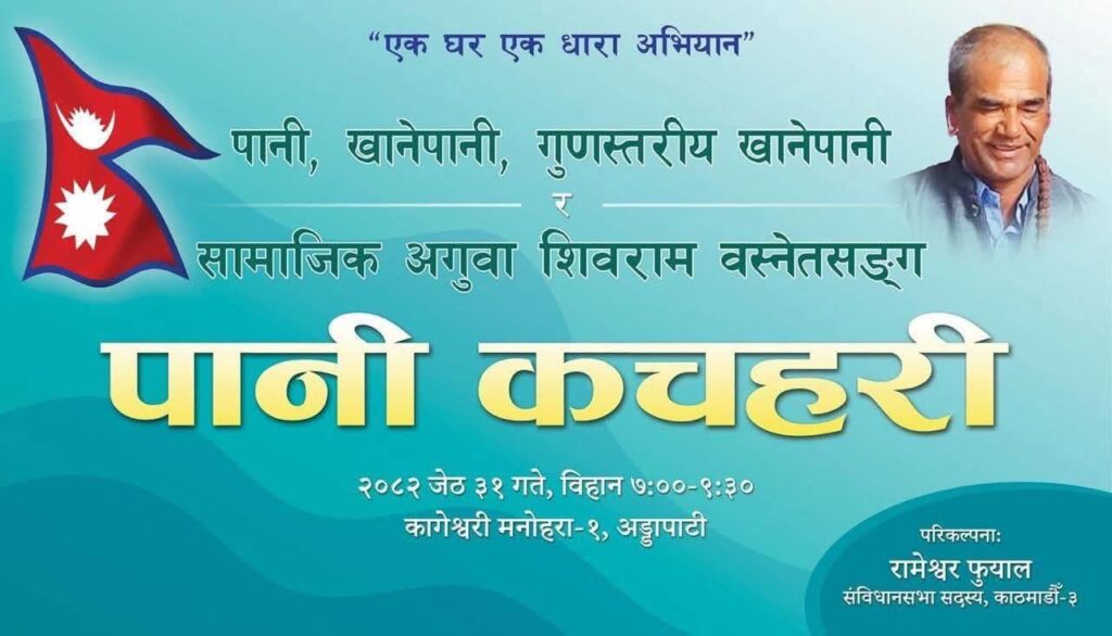 यिनै मेहेनत र सफलतालाई नयाँ पुस्ता सँग जोड्ने परिकल्पना स्वरुप सँबिधान सभा सदस्य एबँ बागमती प्रदेशका पुर्ब मन्त्री रामेश्वर फुँयालले पानी कचहरी नामक रोचक कार्यक्रम आयोजन गर्नुभयो ।
