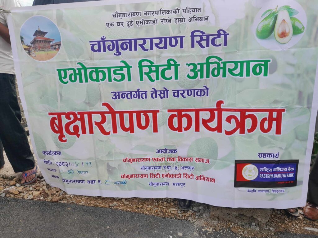 चाँगुनारायण एकता तथा बिकास समाज र चाँगुनारायण सिटी एभोकाडो सिटी अभियानले तेस्रो चरणको बृक्षारोपण कार्यक्रम आयोजनाको शुभारम्भ गर्दै उक्त जानकारी गराएको हो । चाँगुनारायण नगरपालिका वडा नँ ४ मँगलटार खोरिया गाउँमा आज एपोकाडोको ३ सय ५० वटा बिरुवा बिरण गर्दै आयोजनाका परिकल्पनाकार डिपी ढकालले चाँगुनारायण नगरपालिकाका १७ हजार घरमा प्रति घर २ वटा बिरुवा लगाउने अन्तरगत टोल टोलमा बिरुवा बितरण गरेको जानकारी गराउनू भयो ।